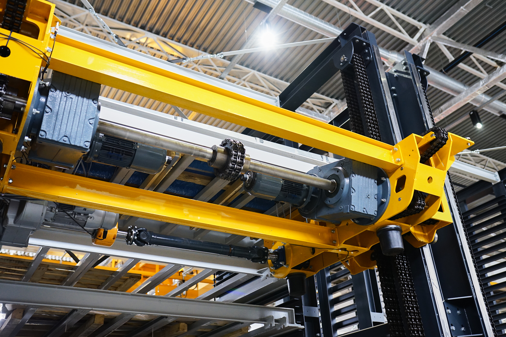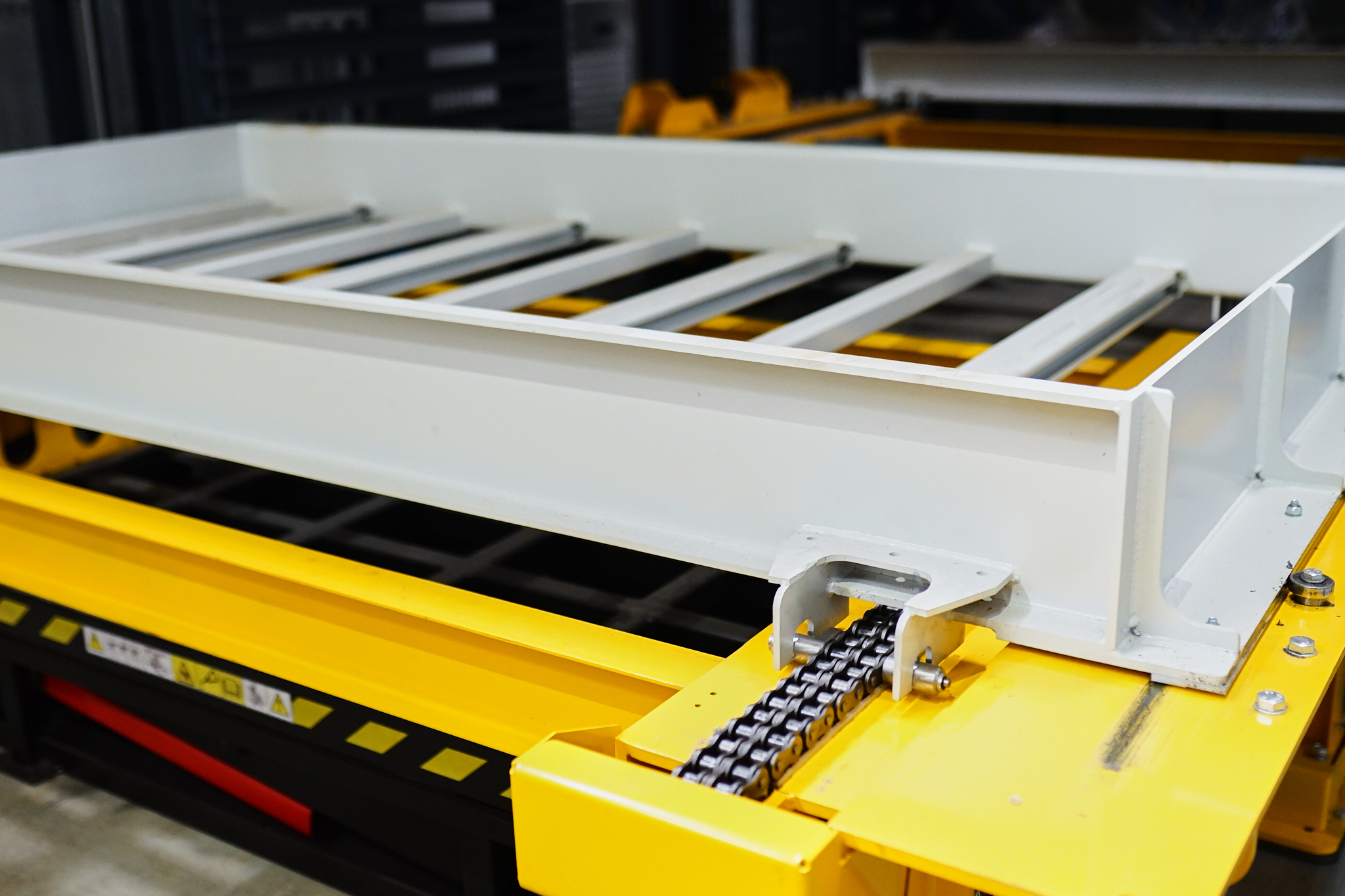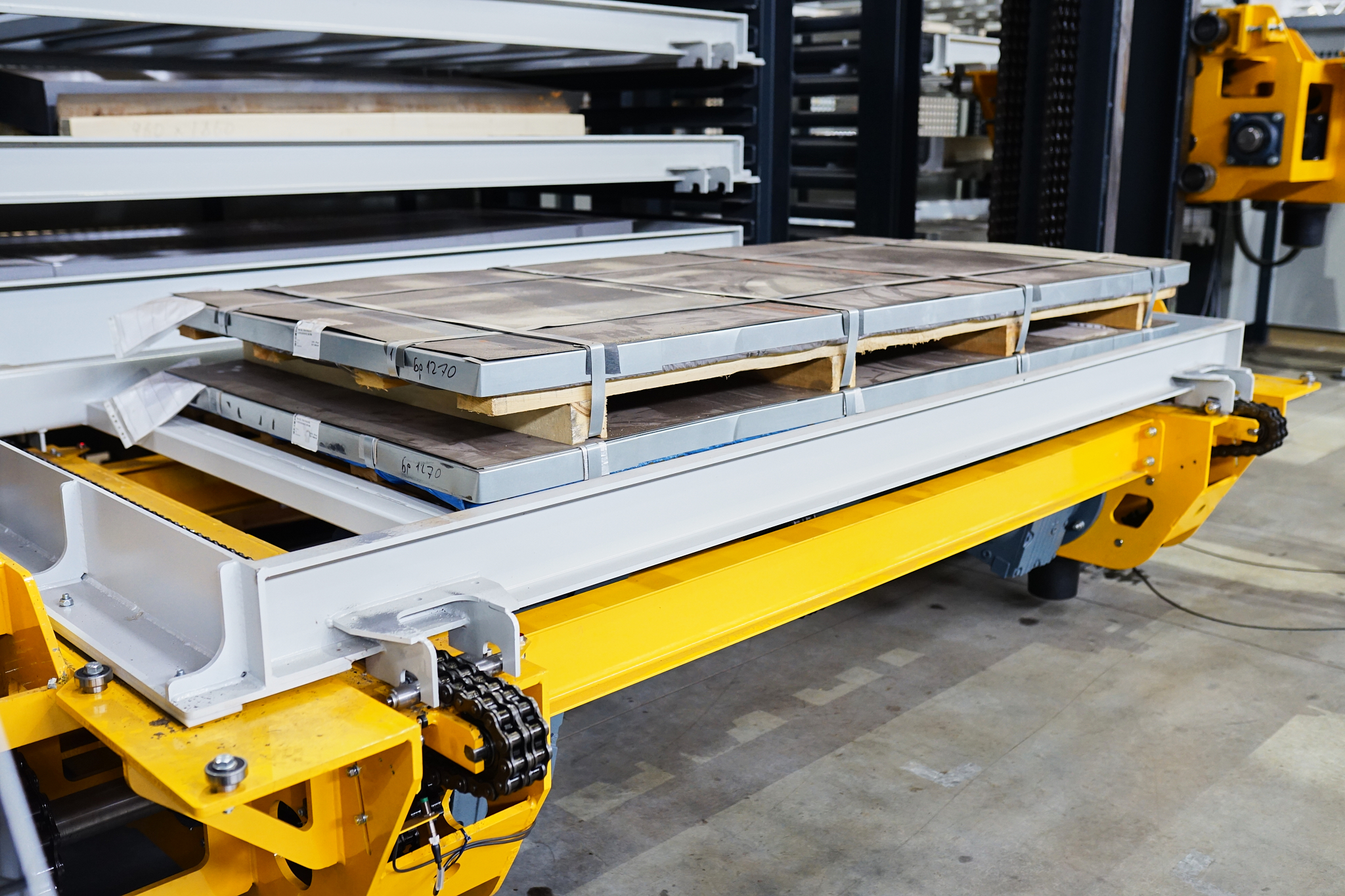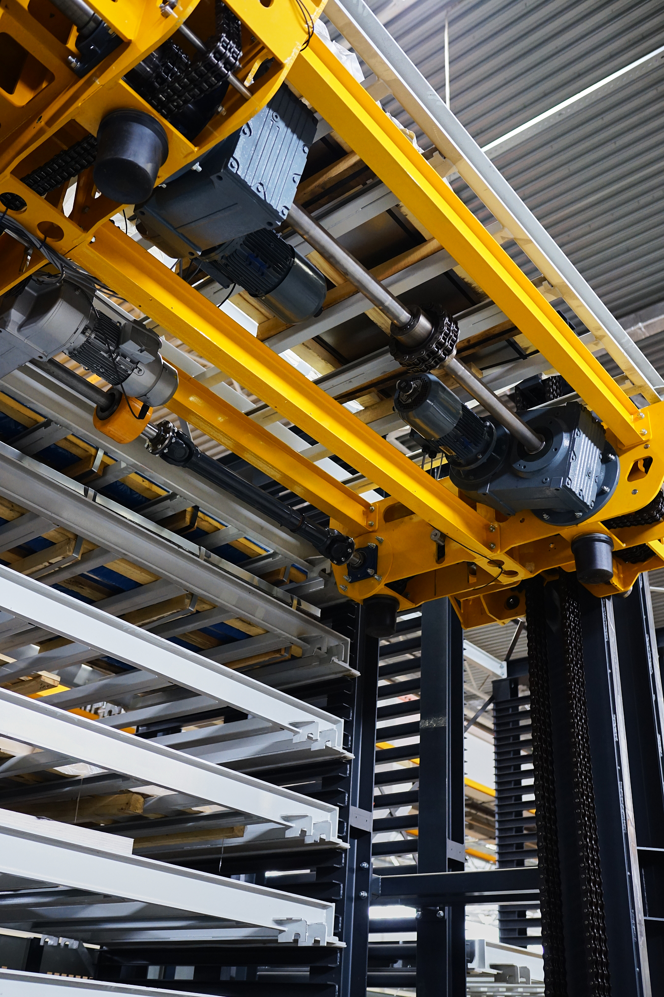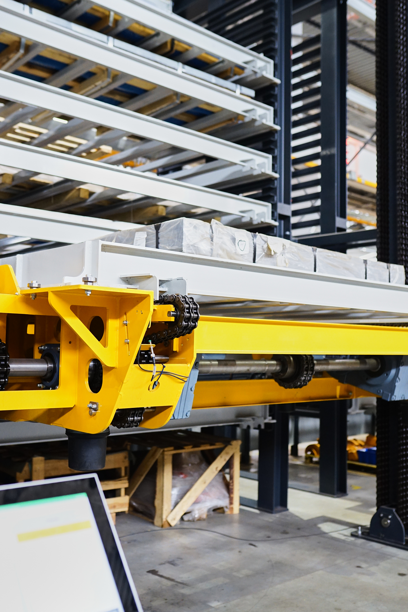 Аўтаматызаваны склад канструктыўна выкананы з апорнай структуры, дзе ўваход і выхад тавараў аўтаматызаваны з дапамогай або чаўнака або выцягваючага і падымаючага механізма.