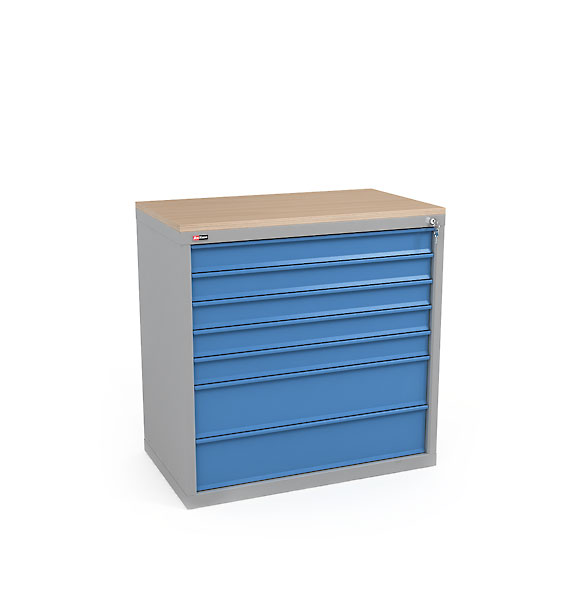 Тумба имеет 7 выдвижных ящиков. Ящики закрываются на один общий замок «EURO-LOCKS» с надежностью 2000 комбинаций.Можно дополнительно приобрести пластиковые лотки для ящиков тумбы.