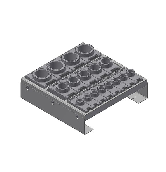 Рама представляет собой несколько секций для держателей инструмента и полностью заполняет по ширине и глубине ящик тумбы соответствующего типоразмера. Предназначена для бережного хранения и перемещения оснастки и оправки.
