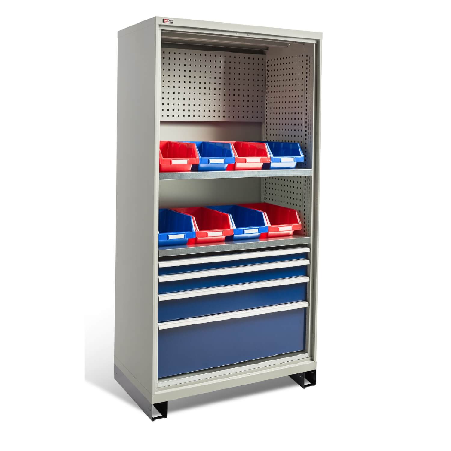 Шкафы и модули окрашены эпоксидной порошковой краской, устойчивой к механическим воздействиям и агрессивным жидкостям. Корпус и экран – серые RAL 7038; ящики и двери – темно-синие RAL 250 20 20; Подставка – черный RAL 9005.